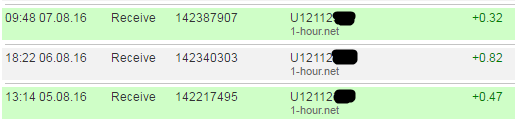 08.08.16 00:20 Receive Received Payment 10.5 USD from account U12112343 to account U986****. Batch: 142447883. Memo: API Payment. Выплата с проекта 1-hour.net.