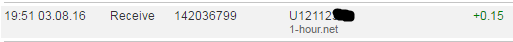 08.03.16 19:04 Account Receive +0.77 Received Payment 0.77 USD from account U12112343 to account U17755**. Batch: 142032463. Memo: API Payment. Выплата с проекта 1-hour.net.