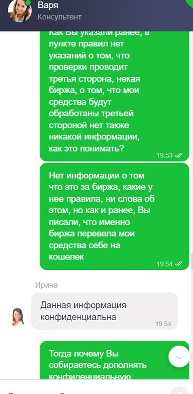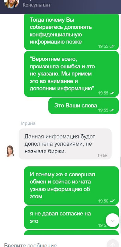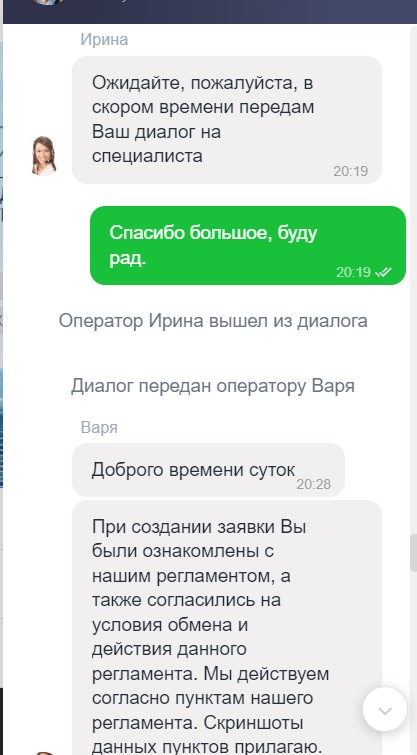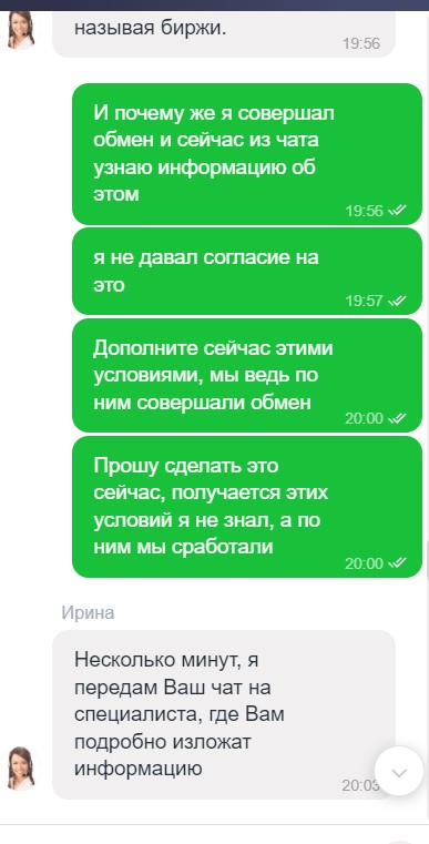 При обращении к менеджеру через чат - кидают в телегу. В телеге непонятный менеджер ставит свои курсы и условия. На сайте была указана одна сумма, менеджер трясет с меня другую. Придумывают какую-то комиссию на обмен, про которую на сайте не знают. Все скриншоты имеются.