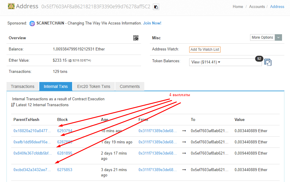 И все это возможно проверить, заглянув в кошелек контракта: