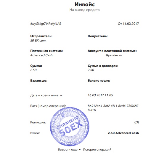 The amount of 4 USD has been deposited to your Perfect Money account. Accounts: U13419671->U195****. Memo: API Payment. 50EX withdrawal.. Date: 05:05 16.03.17. Batch: 168811819.