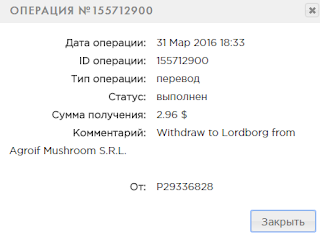 Сумма 1,38 USD была зачислена на ваш идеальный счет деньги. Счета: U10980751-> U3715282. Напоминание: API оплаты. Вывод на kot005 из Agroif Грибной SRL. Дата: 3:54 01.04.16. Batch: 126014852.