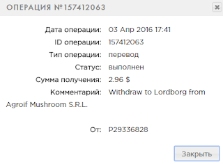 04.04.16 17:53 Account Transfer -300.00 Sent Payment: 300.00 USD to account U10980751 from U6711***. Batch: 126720291. Memo: Shopping Cart Payment. Deposit to Agroif Mushroom S.R.L. User oleg3007.