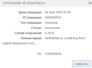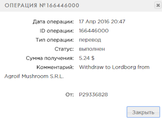 Выплата 18.04.16 06:20 Receive Received Payment 4.6 USD from account U10980751 to account U3992234. Batch: 128912328. Memo: API Payment. Withdraw to InvestPastuh from Agroif Mushroom S.R.L.