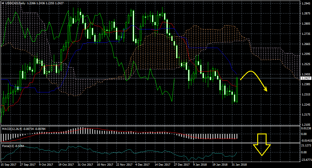 Ситуация по usd/cad медвежий настрой по паре все еще сохраняется, при этом возможен рост на импульсе от нонфарма до целей 1,2500. Индикаторы показывают что цена все еще находиться ниже нулевого уровня и конечно стохастик подходит к зоне перекупленности что так же говорит в пользу как минимум коррекции от роста с возможным падением к старым целям 1,2300. Прогноз на февраль месяц, возможны входы в рынок по этой паре в торговом дневнике. Конечно не исключен вариант более глобального роста, но это уже по мере поступления событий на рынке форекс по паре usd/cad.