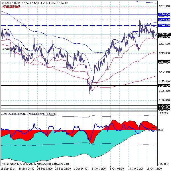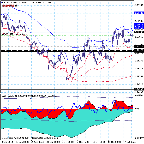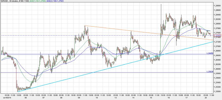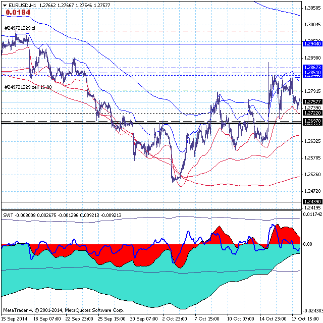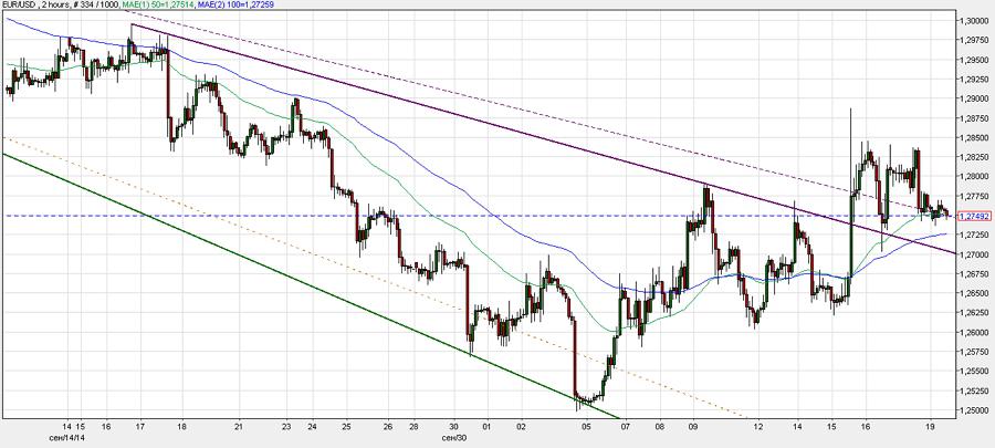 EURUSD – 21.10.14. Продолжается боковое движение в коррекционном канале среднесрочного тренда 1.2439-1.2944, продвигаясь к верхней границе канала