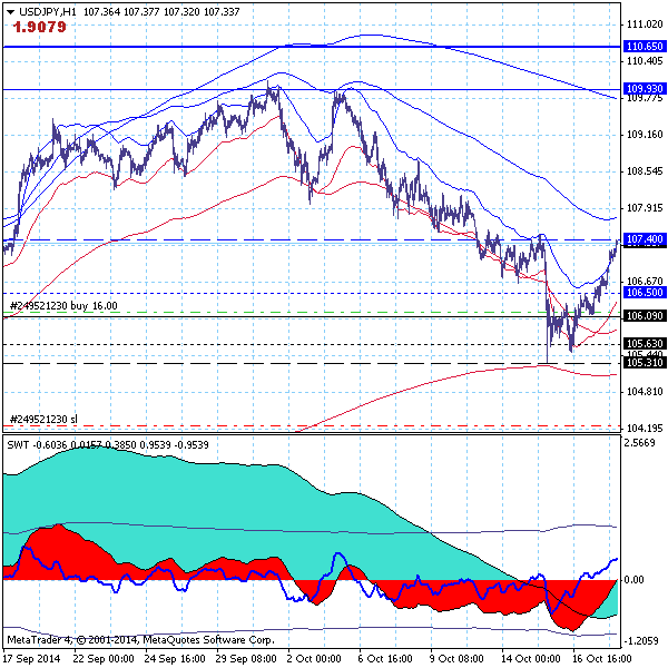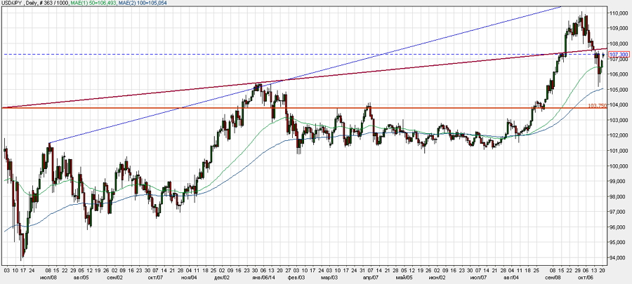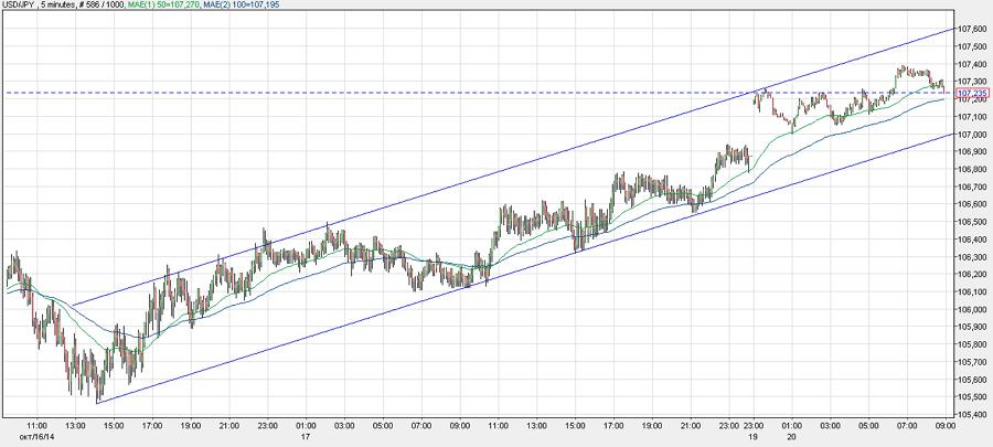 USD/JPY сумела вырасти над предыдущим краткосрочным барьером 106.40 и преодолеть еще один на отметке 107 ровно. Последний сформирован восходящей линией (оранжевая на 2-часовом таймфрейме), которая остановила снижение пары 14 октября.