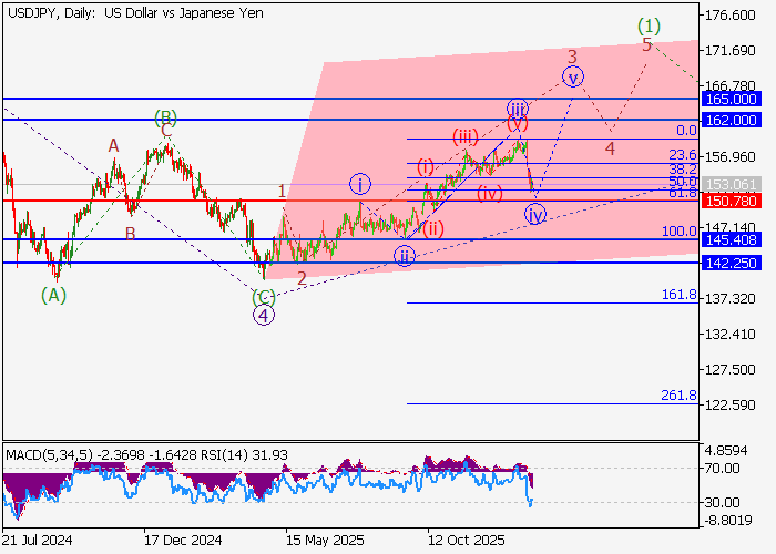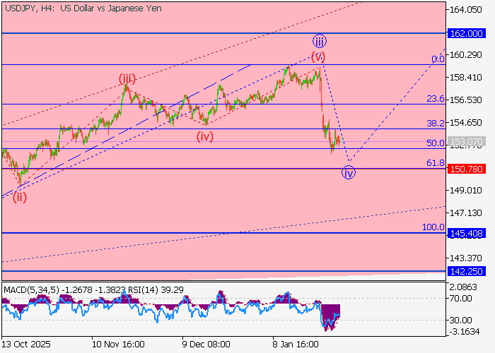 На дневном графике формируются первая волна старшего уровня (1) of 5 и волна 3 of (1). На четырёхчасовом временном интервале окончена третья волна младшего уровня iii of 3 и завершается коррекция в качестве четвёртой волны iv of 3. Если предположение верно, то пара USD/JPY вырастет в район 162.00–165.00. Критическим уровнем стоп-лосса для данного сценария является отметка 150.78.