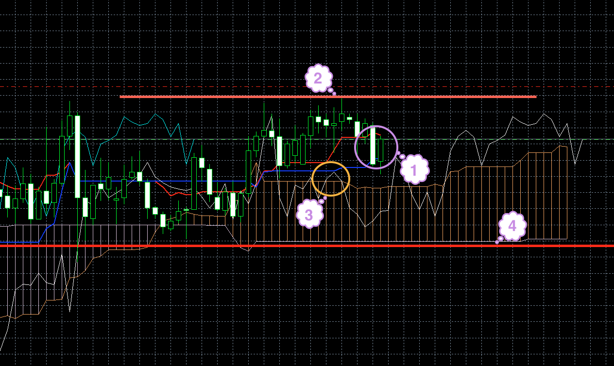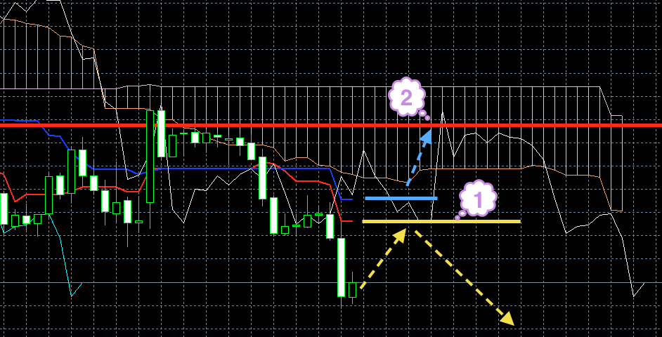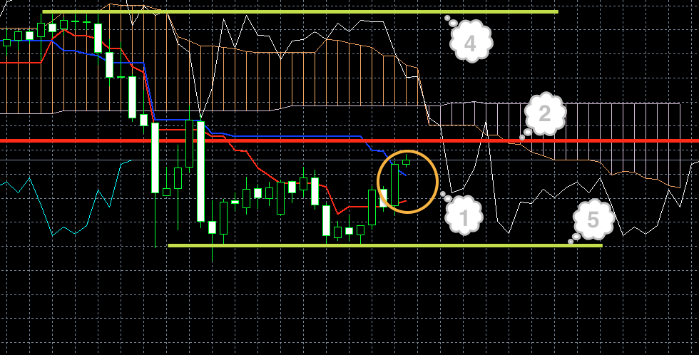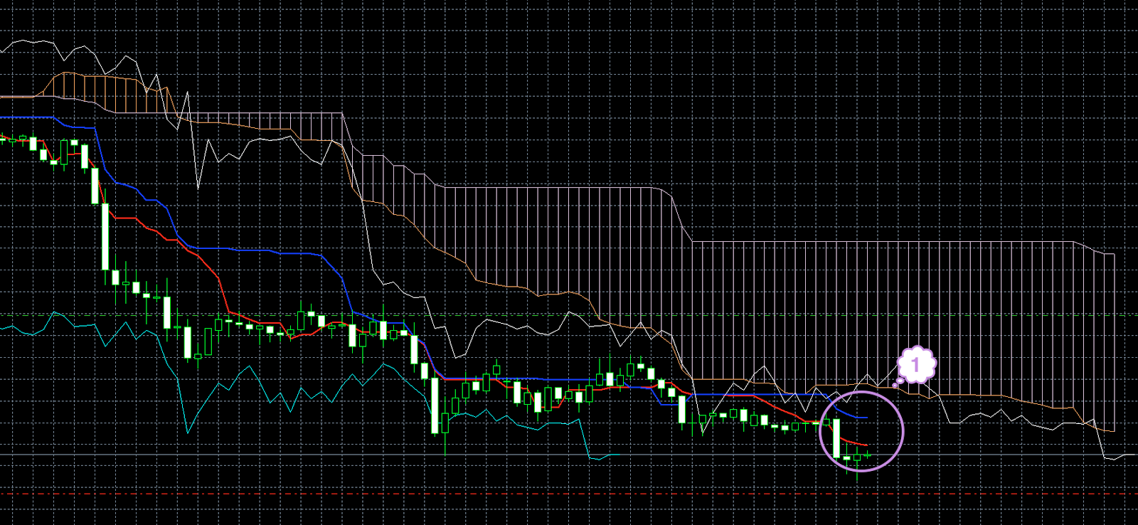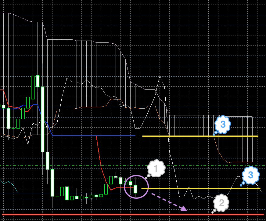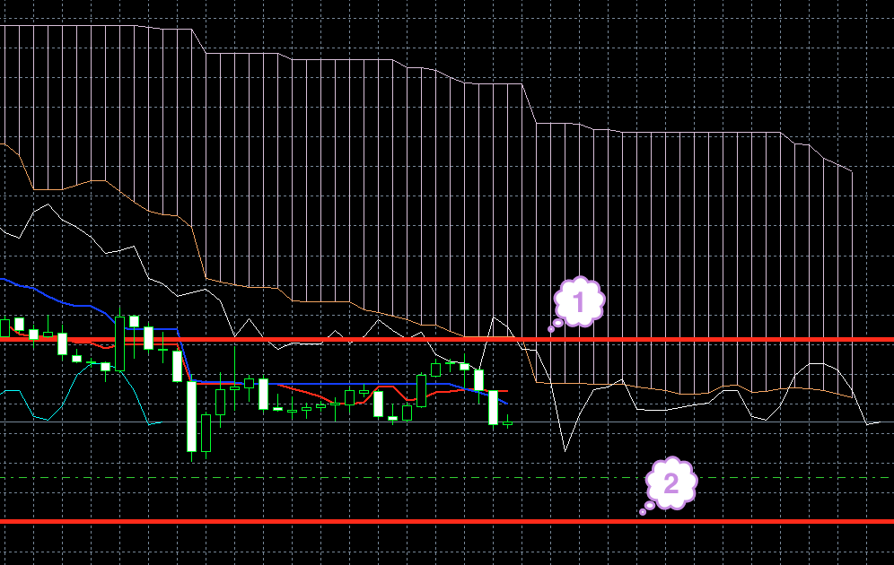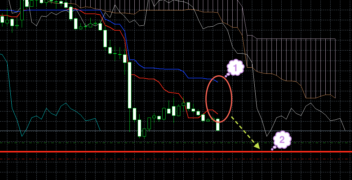 Цена находится под красной линией. Обе линии индикатора Ишимоку находятся под облаком, и красная линия находится под синей (1). Хороший признак того, что цена будет снижаться.