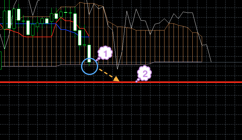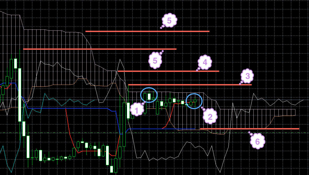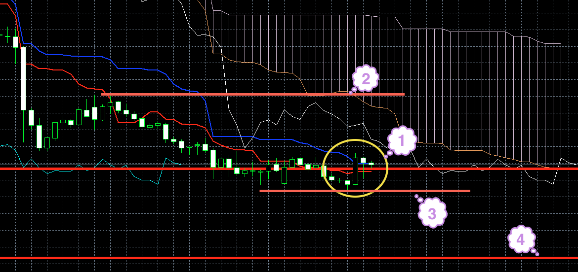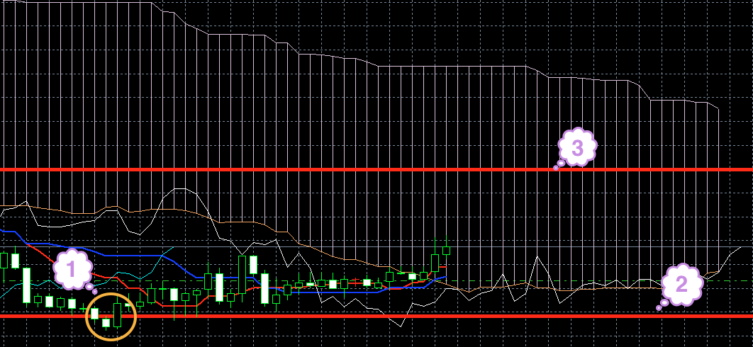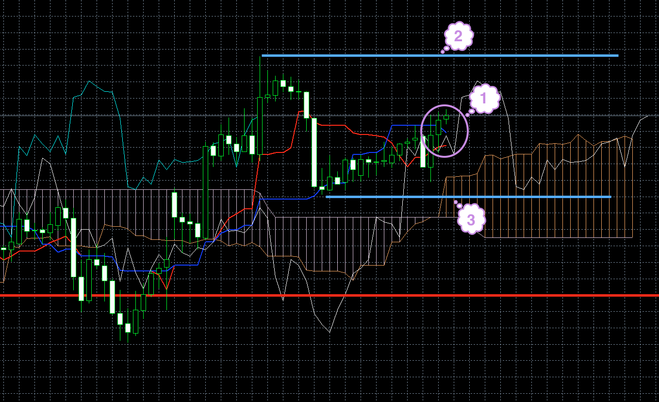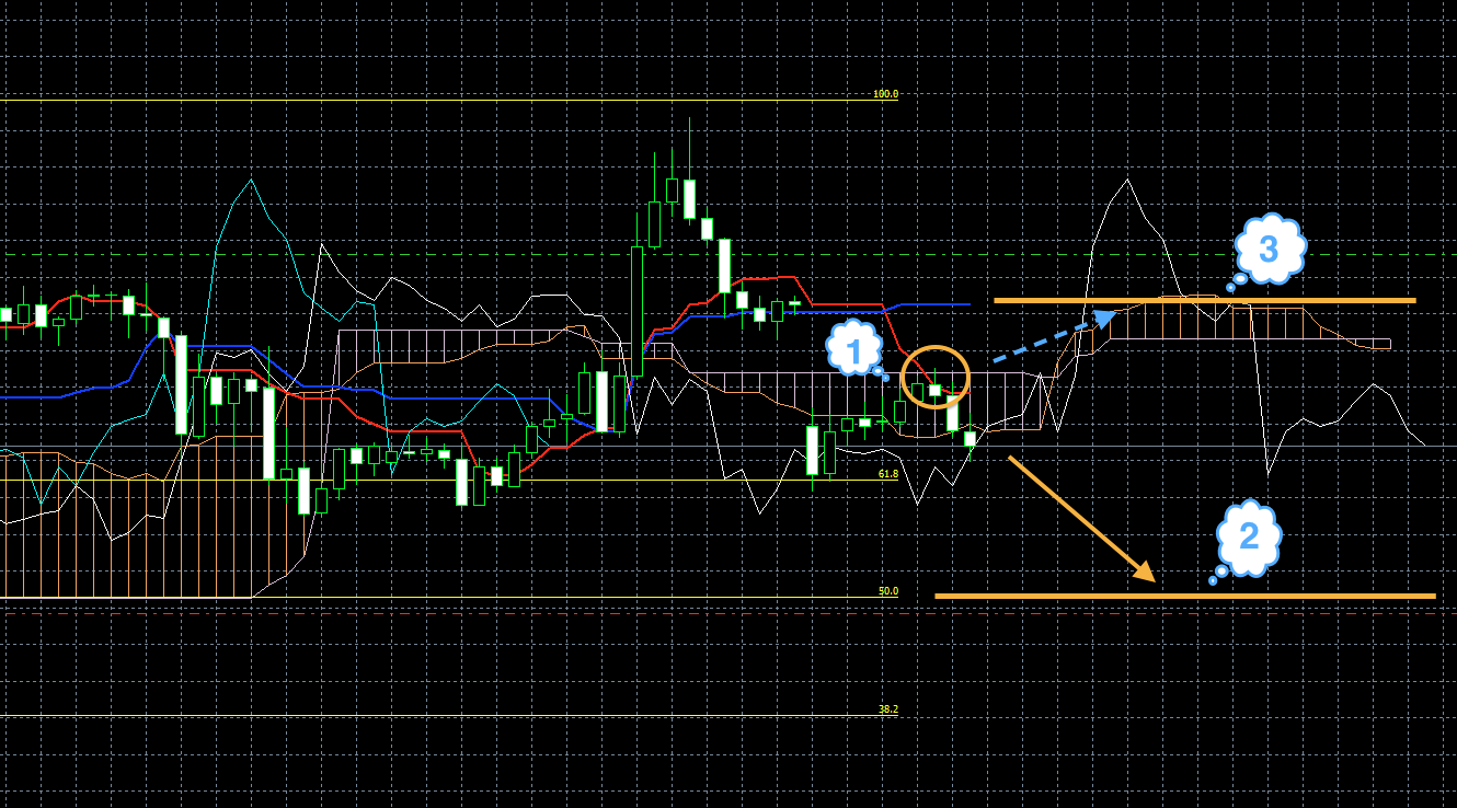 Цена находится под красной линией. Обе линии индикатора Ишимоку находятся под облаком, и красная линия находится под синей (1). Хороший признак того, что цена будет снижаться.