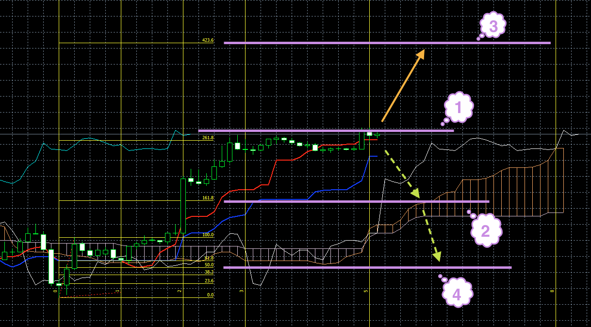 Как видно из картинки, до облака осталось всего несколько часов. И если быкам удастся загнать цену в облако, то шансов у них поднять цену будет гораздо больше, нежели у медведей ее выбить из облака. Если цена попадет в облако (а не опустится раньше), с большей долей вероятности можно говорить о том, что она пойдет к верхней границе ценового коридора (2).