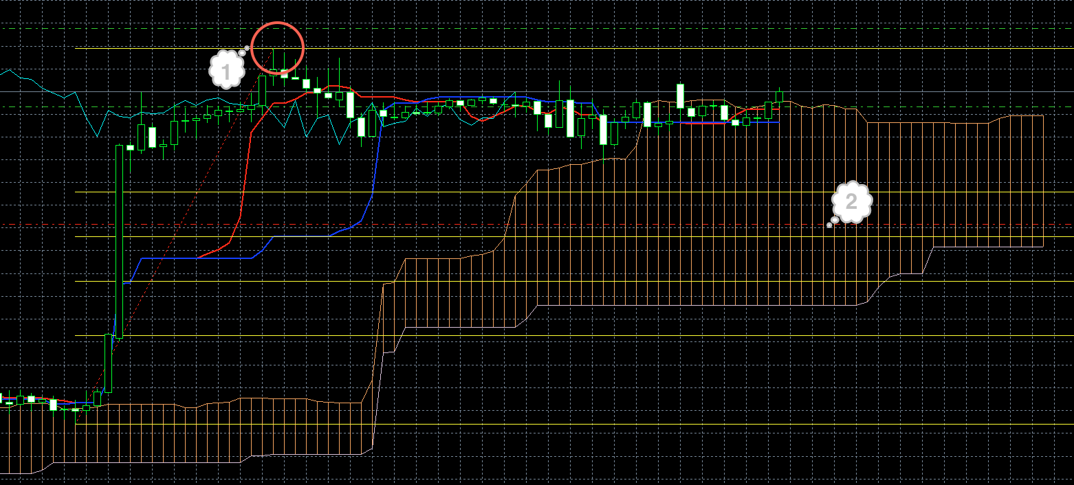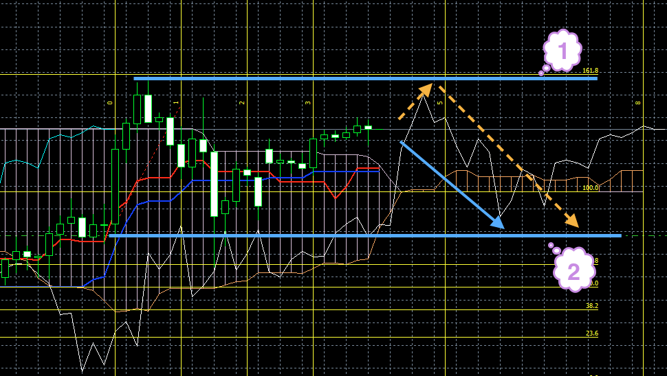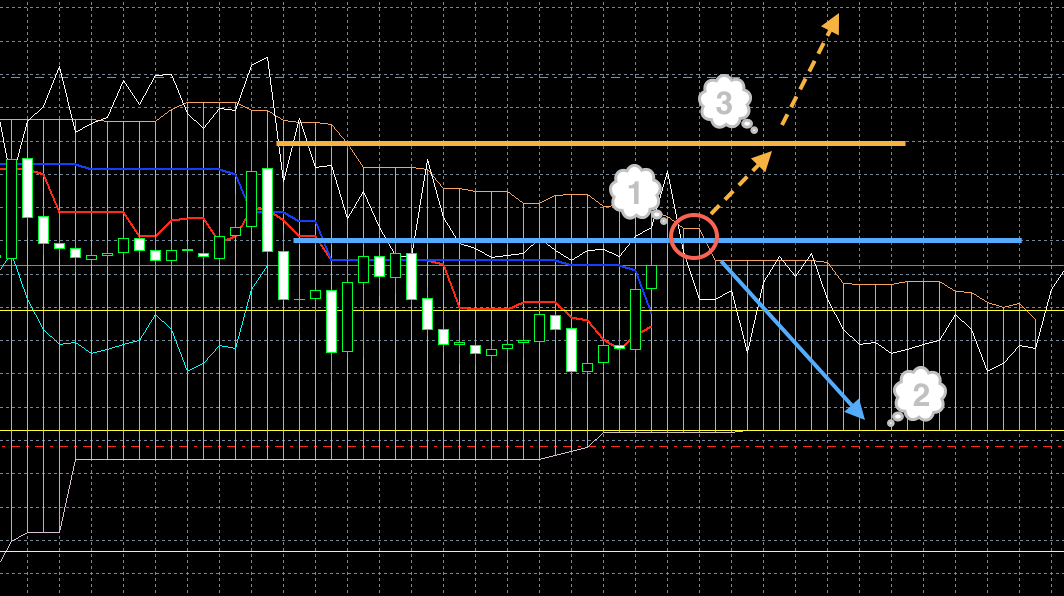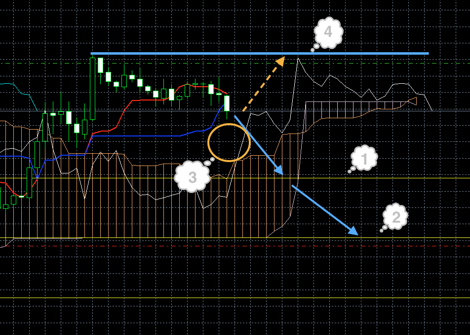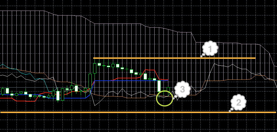 На момент написания обзора синяя линия индикатора Ишимоку смотрит вниз. Это может быть предвестником того, что цена должна сменить направление и пойти вниз (1). Кроме этого знака по косвенным признакам через пару часов стоит ожидать смены направления. Т. е. если цена до этого момента росла, она пойдет вниз. Если опускалась, будет рости.