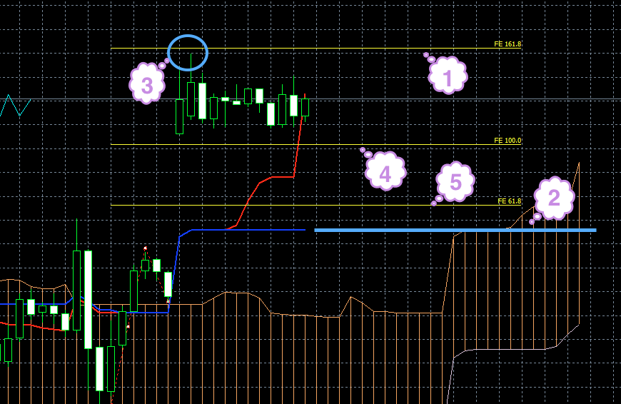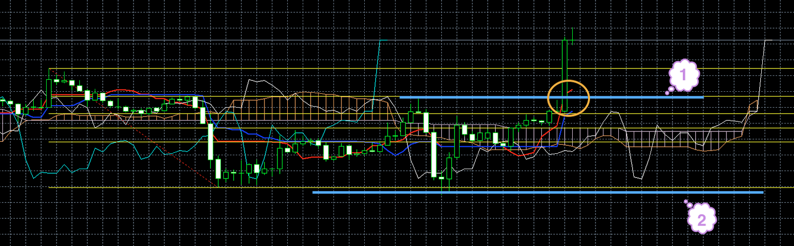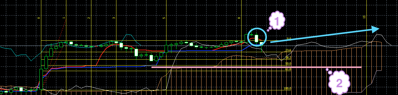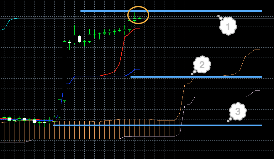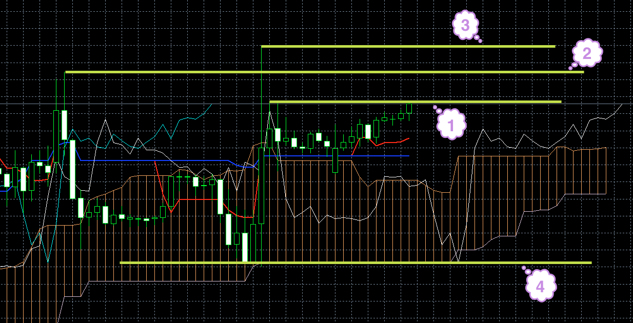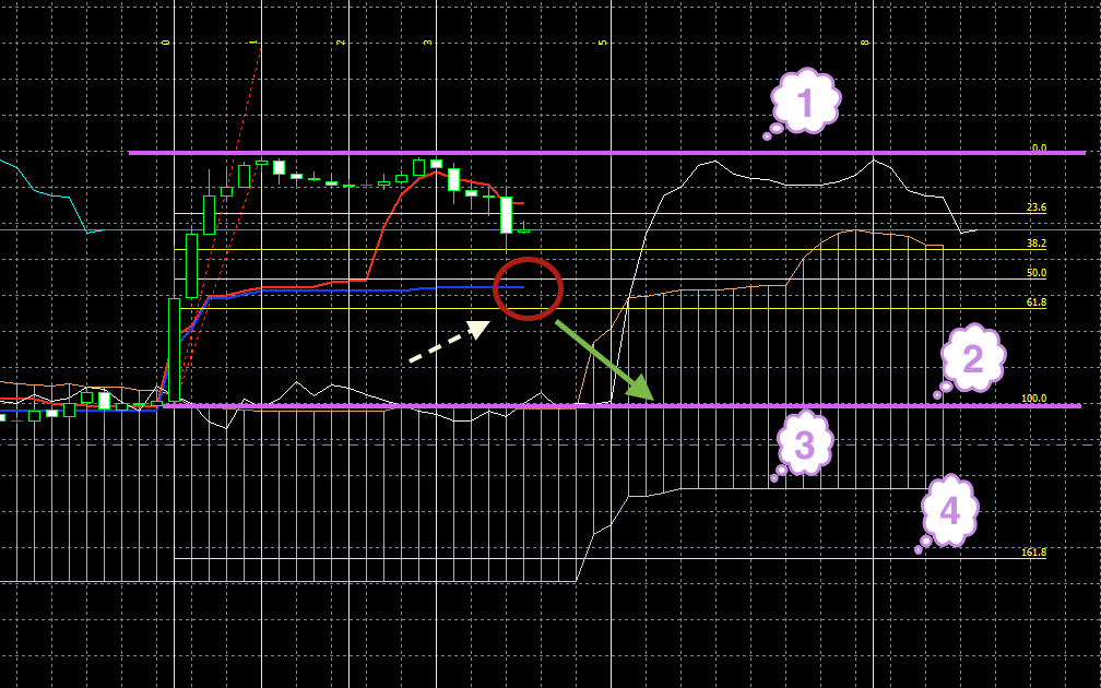 На момент написания обзора синяя линия индикатора Ишимоку смотрит вниз. Это может быть предвестником того, что цена должна сменить направление и пойти вниз (1). Кроме этого знака по косвенным признакам через пару часов стоит ожидать смены направления. Т. е. если цена до этого момента росла, она пойдет вниз. Если опускалась, будет рости.