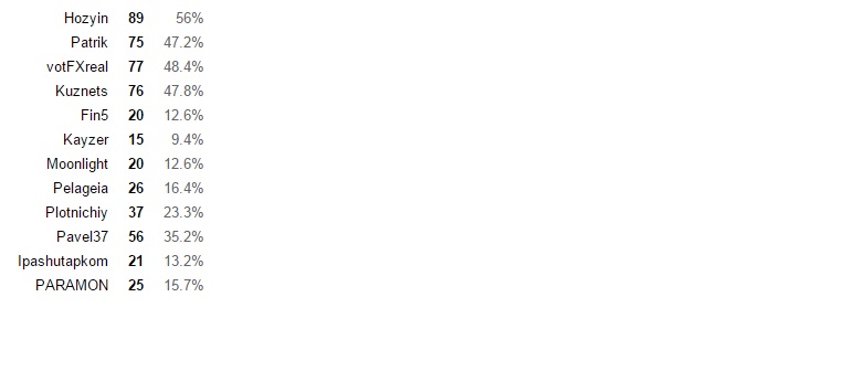 По счетам. Фактически анализировать нечего. Инвест-пароли не выкладываются уже третью неделю, а по мониторингу сложно определить нюансы торговой системы. Такие параметры, как профит-фактор, среднее количество положительных сделок и прибыль с убытком в пунктах может быть дополняют общую картину, но не дают возможность анализировать "чистоту" входов в рынок. Так что пока за неимением материала для изучения беру перерыв.