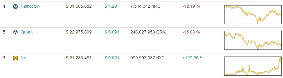 Как я и предполагал подвинули и нэйм, теперь стоим четвёртыми по капитализации. Нужно брать третье место и становиться "бронзой" на крипторынке (золото - битки, серебро - лайтки). PeerCoin, конечно, так просто не сдвинуть как было с кварком и неймкоином - т.к. капитализация вдвое выше, но, думаю, по тихоньку-полегоньку за дня 4-недельку вполне можно будет подвинуть. При условии, конечно, что и дальше рост будет.