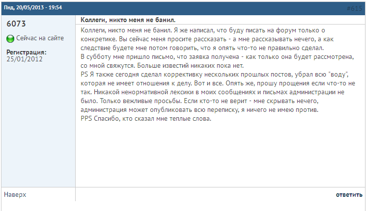 6073 никто не банил, он написал, что сам правил свои сообщения.
