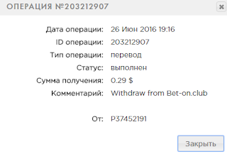 06.26.16 17:43 Account Receive +2.41 Received Payment 2.41 USD from account U11150366 to account U4731311. Batch: 137781568. Memo: API Payment. Bet-on Club