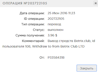 23:56 25.06.16 Received Payment 0.78 USD from account U6013242. Memo: API Payment. Payment ID: Id_106_Withdraw_to_from_Betrix_Club_LTD. 137732995