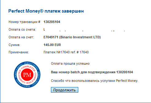 The amount of 4.2 USD has been deposited to your Perfect Money account. Accounts: U7773487->U34***79. Memo: API Payment. Withdrawal for Alexomsk from Binario Investment LTD.. Date: 03:45 26.04.16. Batch: 130211141.
