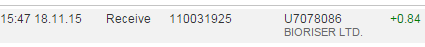 BIORISER LTD. Received Payment 0.25 USD from account U7078086. Memo: API Payment. Withdraw to max812. From BIOriser. Date 2015-11-18 15:26:54. Payment ID: 7787