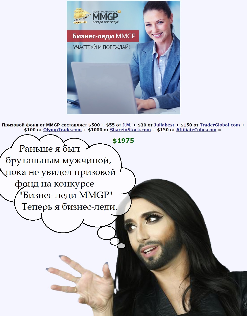 Модераторы пока отписались о 575 у.е.,а в топике темы уже : Бизнес-леди MMGP - 2015 Призовой фонд от MMGP составляет $500 + $55 от J.M. + $20 от Juliabest + $150 от TraderGlobal.com + $100 от OlympTrade.com + $1000 от ShareinStock.com + $150 от AffiliateCube.com =