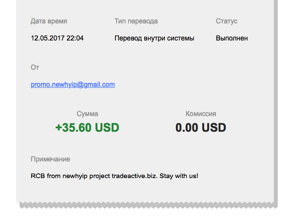 The amount of 7.35 USD has been deposited to your account. Accounts: U4620553->U11211***. Memo: API Payment. RCB from newhyip project tradeactive.biz. Stay with us!.. Date: 20:18 12.05.17. Batch: 175934790.