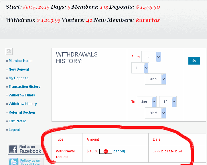 тут к сожалению прокол у меня - 10-ку потерял (ну за минусом рефбека), понадеялся, что с монхайпа будут хоть какие-то люди и эта какшка несколько дней протянет... но людей нет вообще - стата на сайте жалкая, да и та похоже рисованная (несколько раз выплаты увеличивались на 10-20 баков, но денег я так и не получил - пендинг, а в разделе поддержки статистика оказалась вообще совсем другая - Start: Jan 5, 2015 | Days: 5 | Members: 276 | Deposits: $ 1001 Withdraw:$ 890.55)