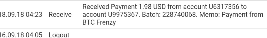 The amount of 1.98 USD has been deposited to your account. Accounts: U6317356->U194****. Memo: Payment from BTC Frenzy. Date: 02:59 07.09.18. Batch: 227478978.