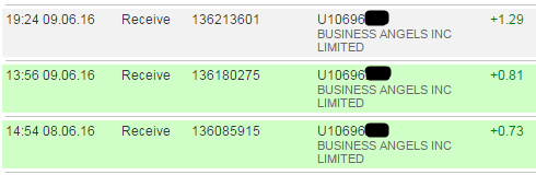 23:15 09.06.16 Receive 136231512 U10696275 BUSINESS ANGELS INC LIMITED +0.47 Received Payment 0.47 USD from account U10696275. Memo: API Payment. User bizman-invest.com.