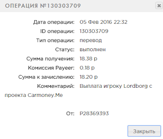 Комментарий: Выплата игроку Riafb.iz с проекта Carmoney.Me