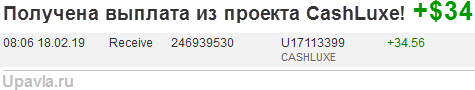 The amount of 3.88 USD has been deposited to your account. Accounts: U17113399->U15*. Memo: API Payment. Withdrawal Cashluxe Holding.. Date: 08:01 19.02.19. Batch: 247075181.