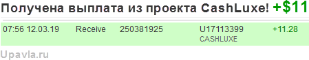 The amount of 3.38 USD has been deposited to your account. Accounts: U17113399->U15*. Memo: API Payment. Withdrawal Cashluxe Holding.. Date: 08:07 13.03.19. Batch: 250554649.