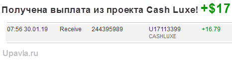 CASHLUXE +3.00 Received Payment 3.00 USD from account U17113399. Memo: API Payment. Withdrawal Cashluxe Holding. Payment ID: 1474
