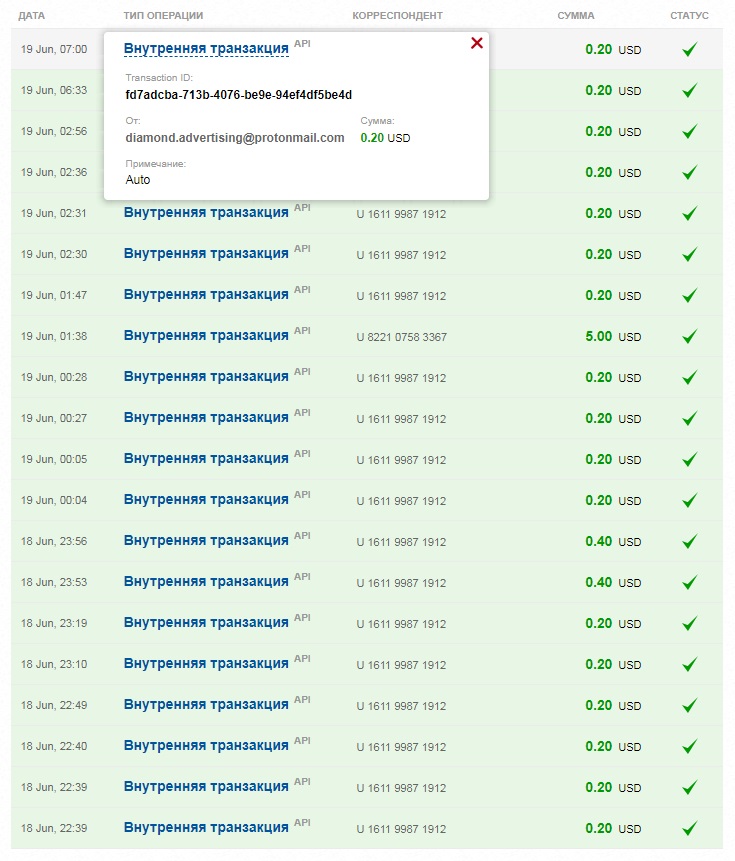 The amount of 0.25 USD has been deposited to your account. Accounts: U17708407->U45809. Memo: API Payment. Auto.. Date: 04:07 19.06.18. Batch: 218338231.