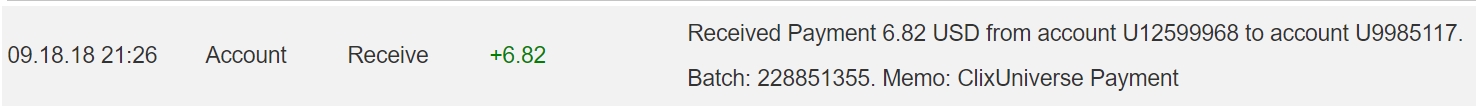 The amount of 9.1 USD has been deposited to your account. Accounts: U12599968->U2054***. Memo: ClixUniverse Payment. Date: 21:20 28.08.18. Batch: 226160420.