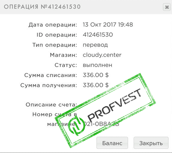 Cloudy Center +1.00 Received Payment 1.00 USD from account U13148102. Memo: API Payment. Payment to user ProfitHuntersBIZ from Cloudy Center.
