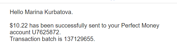 The amount of 4.09 USD has been deposited to your Perfect Money account.