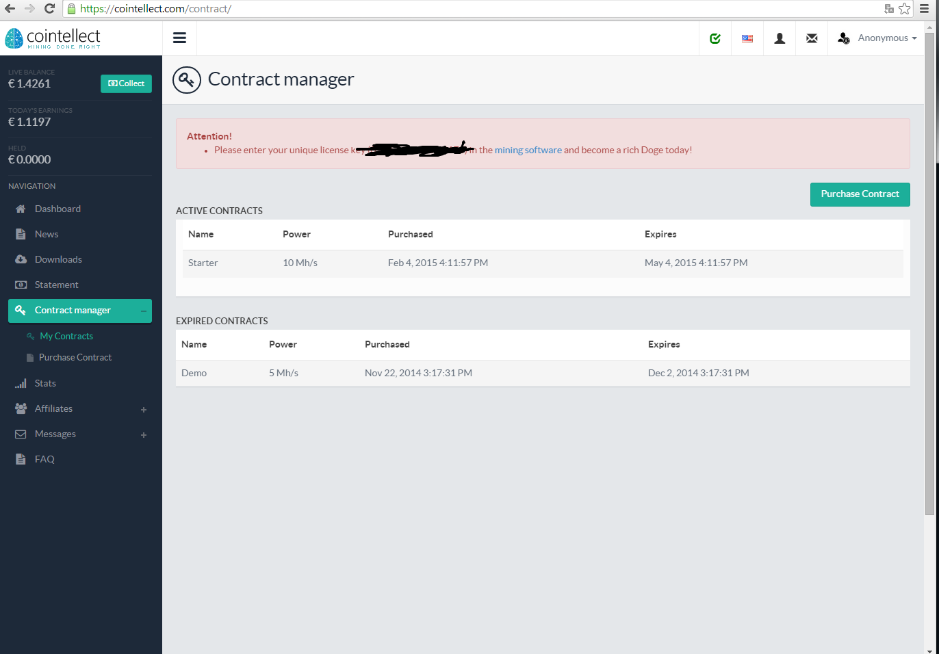 У меня тоже один аккаунт и только контракты (без майнеров), причем я так понимаю, что сумма контрактов у меня побольше твоих, потому как у меня в день падает €163, последняя выплата была только 26-го, 30-го все запросы которые висели, также как и многим вернули на баланс, я заново сделал запросы, но тем не менее до сих пор ничего не поступало, но тем не менее, я не паникую, более того, все что у меня скопилось после 30-го, а это почти €900, я даже не пытался вывести, но все равно считаю, что не стоит ни паниковать самому, ни тем более наводить панику среди других. У меня в общей сумме (запросы + баланс) уже больше €2000 висит, ну и что? И это при том, что даже на половину не окупил своих контрактов! Просто надо верить и ждать!