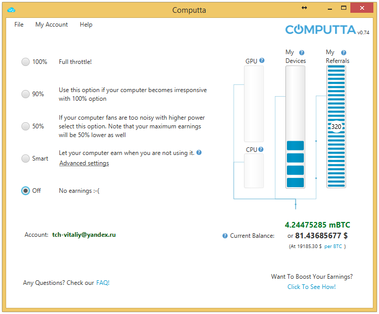 Re: Майнинг биткоин на своем компьютере с приложением Computta