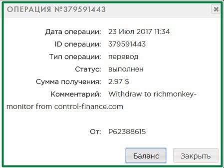 The amount of 33 USD has been deposited to your account. Accounts: U14936417->U4227222. Memo: API Payment. Withdraw to MYHYIPSNET from control-finance.com.. Date: 07:04 23.07.17. Batch: 182758746.