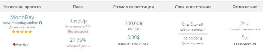 21.09.2016 09:37:04 Исходящий платеж Инвестиция в проект PROJ523730152