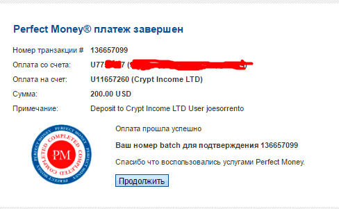 The amount of 25.77 USD has been deposited to your Perfect Money account. Accounts: U11657260->U22*****. Memo: API Payment. Withdraw from Crypt Income LTD.. Date: 11:15 14.06.16. Batch: 136628912.