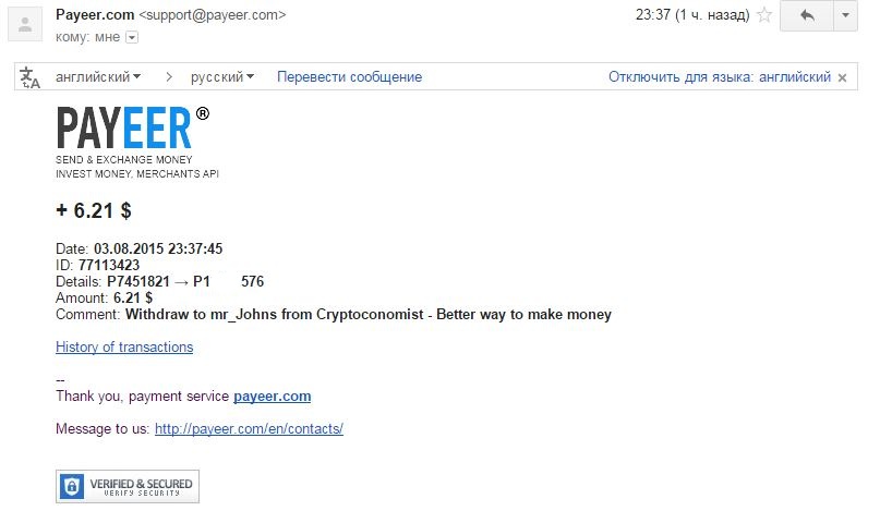 The amount of 0.23 USD has been deposited to your Perfect Money account. Accounts: U4780325->U9566*** Memo: API Payment. Withdraw to Scrudz from Cryptoconomist - Better way to make money.. Date: 21:36 03.08.15. Batch: 96826327.