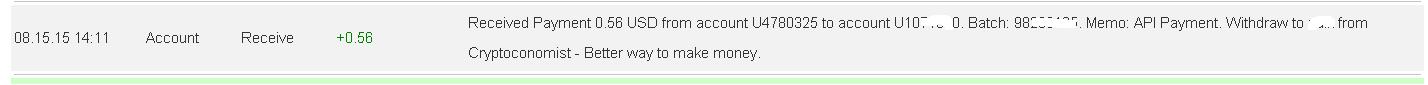 24.08.15 06:03 Received Payment 1.00 USD from account U4780325 to account U754****. Batch: 99198027. Memo: API Payment. Withdraw to Storkben95 from Cryptoconomist - Better way to make money.