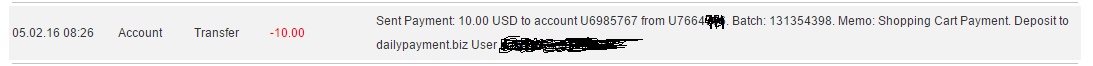 The amount of 10 USD has been withdrawn from your Perfect Money account. Accounts: U166****->U6985767. Memo: Shopping Cart Payment. Deposit to dailypayment.biz User valeo.. Date: 08:54 02.05.16. Batch: 131357082.