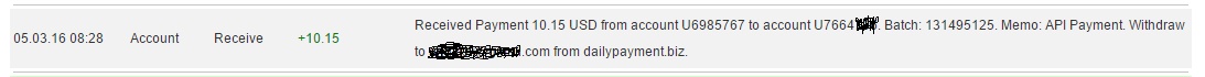 Memo: Received Payment 3.6 USD from account U6985767. Memo: API Payment. Withdraw to monhyip from dailypayment.biz.