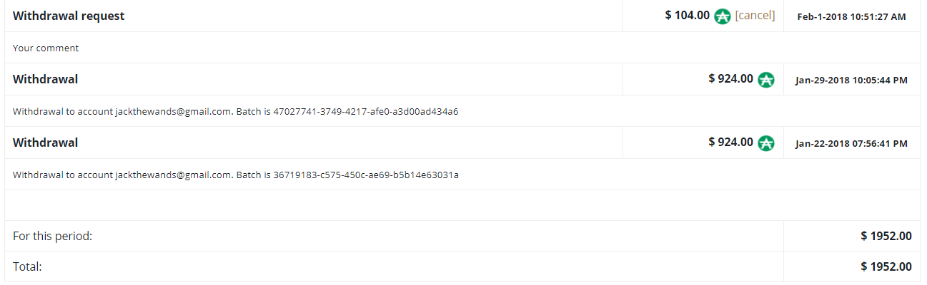 The amount of 20.8 USD has been deposited to your account. Accounts: U14916532->U13038***. Memo: API Payment. Withdraw to MenW from Digitalbit.biz.. Date: 13:11 02.02.18. Batch: 203893330.