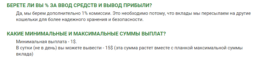 Зачем нужно ограничение на сумму вложения? Не секрет, что бОльшая часть проектов закрывается почти сразу после открытия. Вины администратора в этом обычно нет, просто часто происходит так, что приходит крупный инвестор с суммой >1000$, и прибыль, которую он должен получить "съедает" депозиты многих других вкладчиков. Начинается перетягивание баланса в сторону этого крупного инвестора. В данном проекте исключены эти случаи, и сделано всё, чтобы "сгладить" поступление и выплаты средств, сделать развитие более плавным.