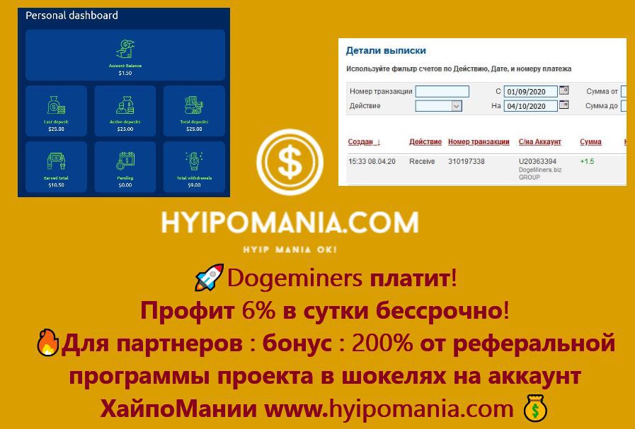Обзор бессрочника Dogeminers ( профит 6% в сутки ) на ХайпоМании: по ссылке в подписи.