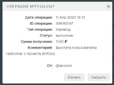 Комментарий: Выплата пользователю doktor54 с проекта drift.biz